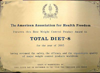 | 2000国家生技医疗品质奖 | 2000优良食品评鉴金牌奖 | 2003美国健康自由协会评选TD8最佳控重食品 | ||