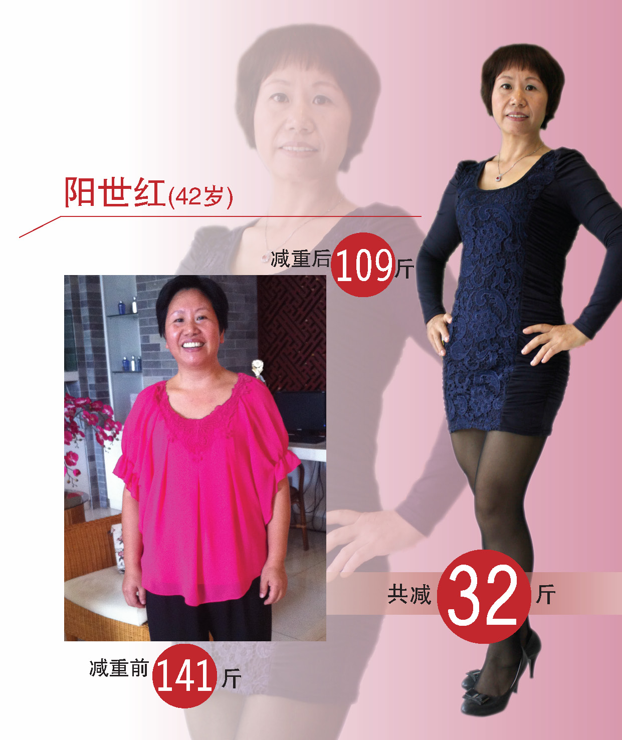 经过我和妈妈的切身感受,我便下定决心减肥。这时我妹妹就介绍体美诗给我,因为她是珊妮的经理,深知体美诗是一种健康的减重方法,它“三通”排“五毒”,低热量、营养均衡,只减肥肉不减瘦肉,减掉内脏脂肪。因为我已经十分恐惧肥胖带来的疾病,所以我十分的努力和坚持。每天4包健又丽-8,4包秀得甜代替2餐,餐前果蔬粉酵素,饭后爱保素;早上跑步晚上练瑜伽,坚持了一段时间后,由原来的142斤减到现在的108斤,足足减掉了34斤,人也年轻漂亮了,“三高”也没有了,所有认识我的人都对我刮目相看,我太开心了。在减重过程中,离不开家人的支持,老公、妹妹、弟弟,特别是妈妈,她对我的促动和帮助太大了。