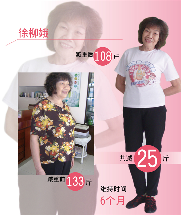 我是徐柳娥,今年66岁,减重前133斤,减重后108斤,共减了25斤,维持了6个月。减重前我身体很不好,有很多慢性疾病像:动脉硬化、高血压、关节炎,自己很担心会中风连累下一代,后来8个月前我女儿叫我去排毒减重,我用了8周就减了25斤,减完后身体好很多、精神很多,高血压也降下来了。通过体美诗的排毒减重计划后,以前常常喜欢吃大鱼大肉的我,现在学会了吃东西要清淡,多吃水果蔬菜,吃大餐前要记得吃益得净帮助我隔除多余油份,吃果蔬粉酵素帮助消化,如果感觉大便不是很顺畅时就睡前吃绿纤与益生菌,这些维持健康的饮食方法我都学会了喔!另外,减肥前我连走路上楼梯都觉得很辛苦不愿意动,减肥后身体健康了,我现在加入了排毒减重俱乐部常常都去树木园行山,公司的阿红说我现在走路比她走得还要快呀。。我现在健康了,我真的很高兴。。我要把健康的身体一直维持下去。。体美诗的产品真棒!