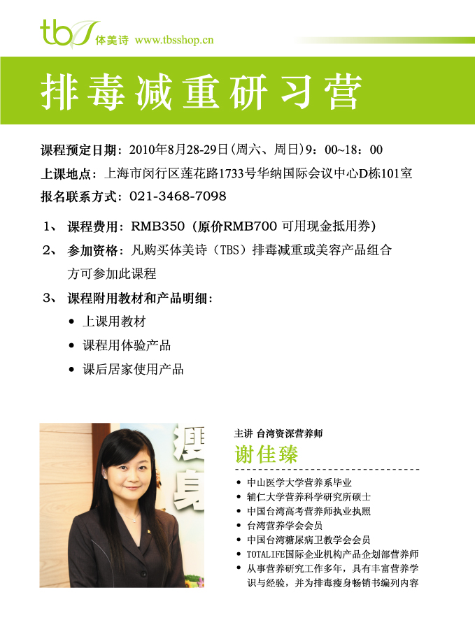 台湾资深营养师谢佳臻排毒减重课程(上海)8月28-29日参加方法